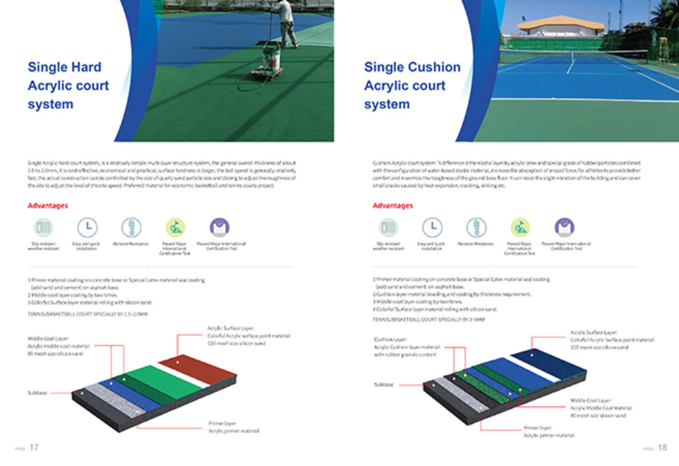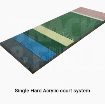 Single Acrylic hard court system, is a relatively simple multi-layer structure system, the general overall thickness of about 1.5 to 2.0mm, it is cost-effective, economical and practical, surface hardness is larger, the ball speed is generally relatively fast, the actual construction can be controlled by the size of quartz sand particle size and dosing to adjust the roughness of the site to adjust the level of the site speed. Preferred material for economic basketball and tennis courts project.