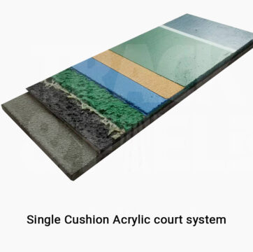 Cushion Acrylic court system ‘s difference is the elastic layer by acrylic latex and special grade of rubber particles combined with the configuration of water-based elastic material, increase the absorption of impact force, for athletes to provide better comfort and maximize the toughness of the ground base floor. It can resist the slight vibration of the building and can cover small cracks caused by heat expansion, cracking, sinking etc.