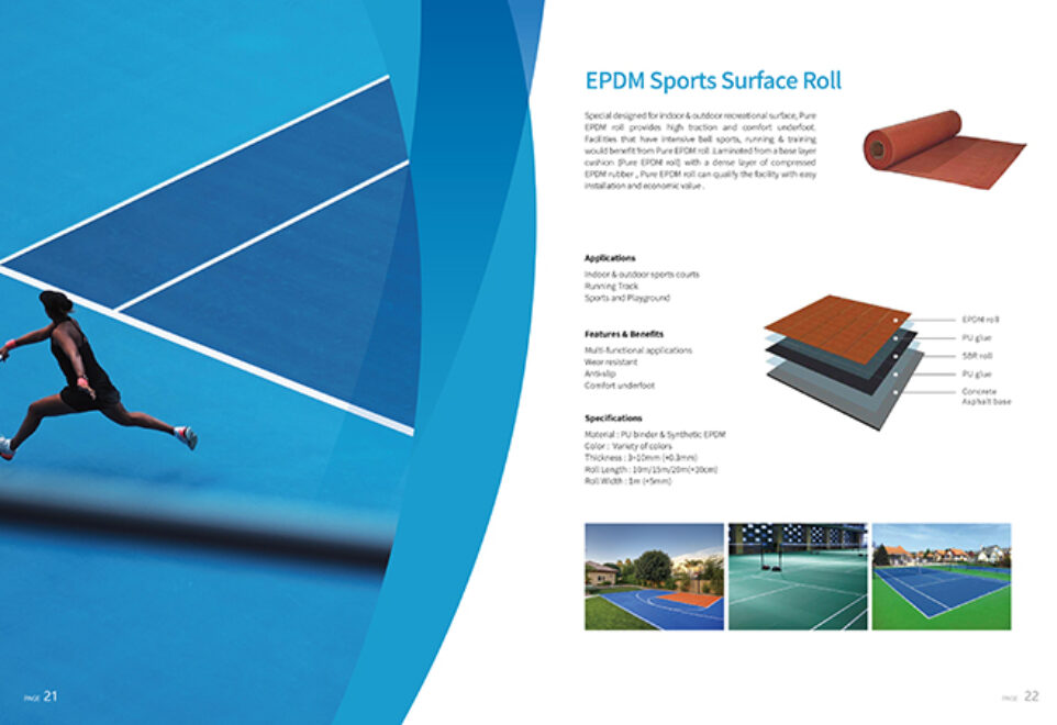 Special designed for indoor & outdoor recreational surface, Pure EPDM roll provides high traction and comfort underfoot. Facilities that have intensive ball sports, running & training would benefit from Pure EPDM roll .Laminated from a base layer cushion (Pure EPDM roll) with a dense layer of compressed EPDM rubber, Pure EPDM roll can qualify the facility with easy installation and economic value.