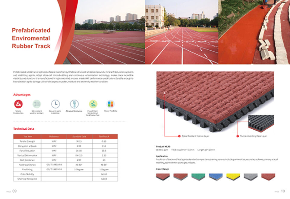2. Prefabricated rubber running track surface is made from synthetic and natural rubber compounds, mineral fillers, color pigments and stabilizing agents, Adopt close-cell microbubbling and continuous vulcanization technology, makes track incredible elasticity and duration. It is manufactured in high controlled process. meets WA performance specification. Durable enough to bear abrasion, spike damage ,ultra violet exposure ,water ,moisture and extremely.